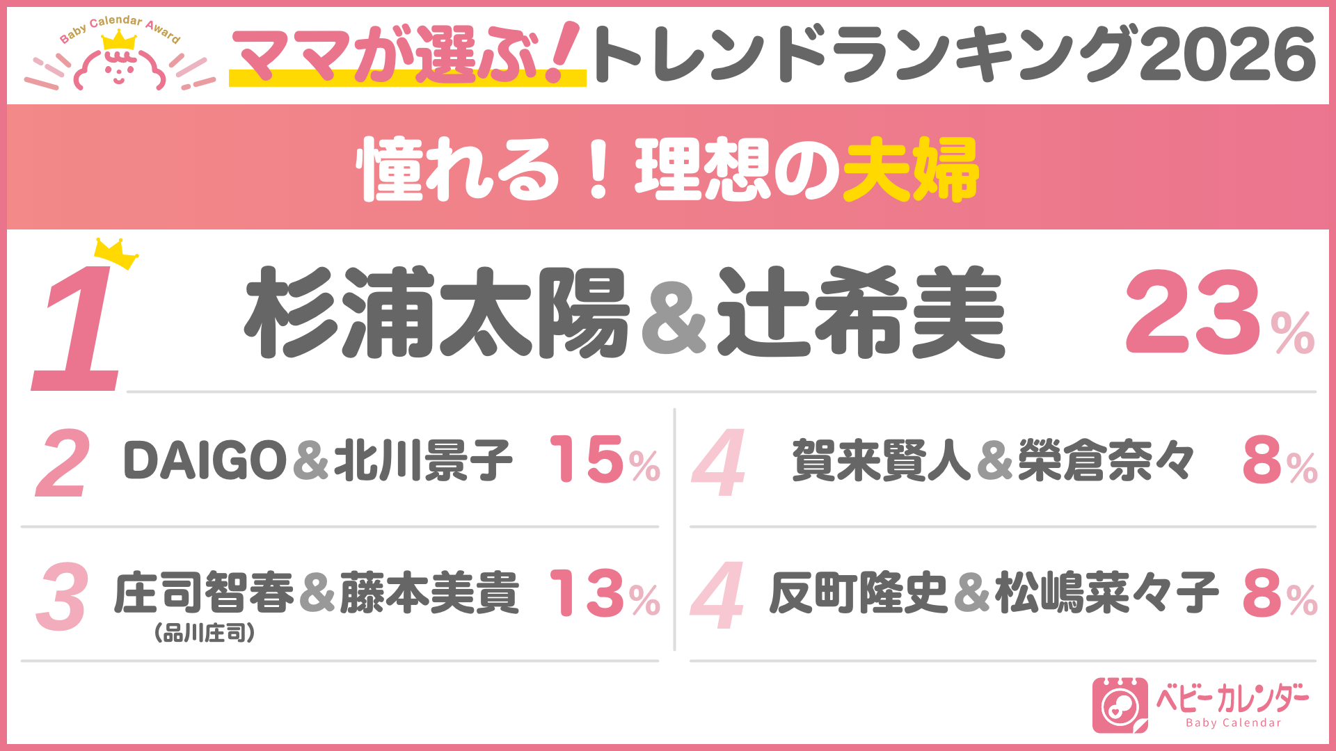 「オープンで仲が良く、対等で信頼し合える夫婦」が上位にランクインしていることがうかがえます。昨年4位だった杉浦太陽さん&辻希美さんは、2025年に第5子が誕生したこともあり、注目度の高まりが順位に影響した可能性も。また、昨年は圏外だった庄司智春さん&藤本美貴さんが3位へ大躍進。メディア露出の増加に加え、YouTubeでのミキティさんの痛快な悩み相談企画や、庄司さんの変わらぬ愛妻家ぶりが再評価された結果といえそうです。