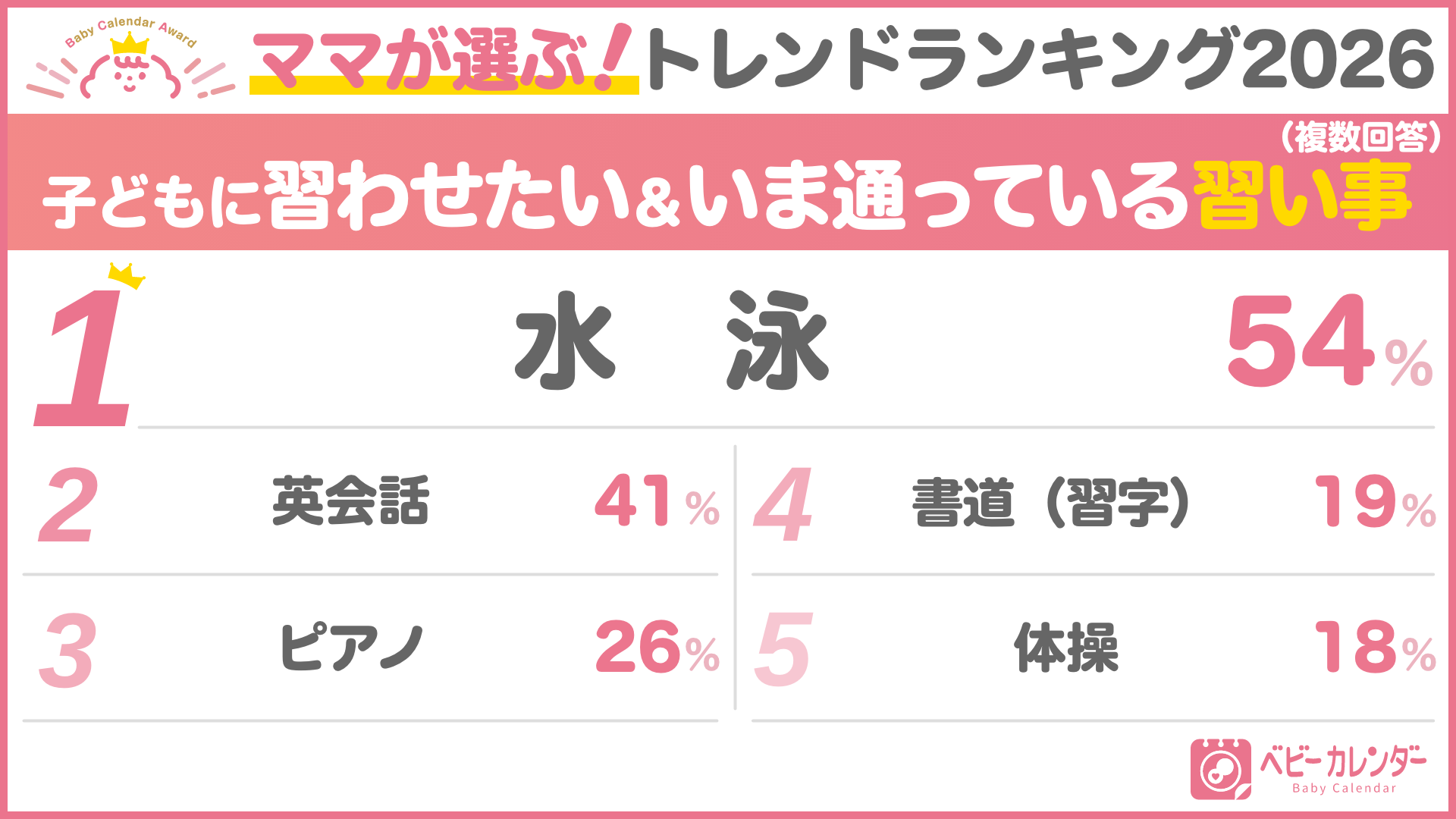 昨年に続き、水泳が今年もトップに。体力づくりや健康のための習い事として、根強い人気がうかがえます。一方で、昨年から順位が入れ替わったのがピアノと英会話。グローバル時代を見据えた“使える力”への期待の高まりが感じられます。昨年5位だったそろばんは8位へ順位を下げ、6位にダンス、7位に学習塾・幼児教室がランクイン。表現力の育成や早期教育など、子どもの個性や将来性を多角的に伸ばしたいというニーズの多様化がうかがえる結果となりました。