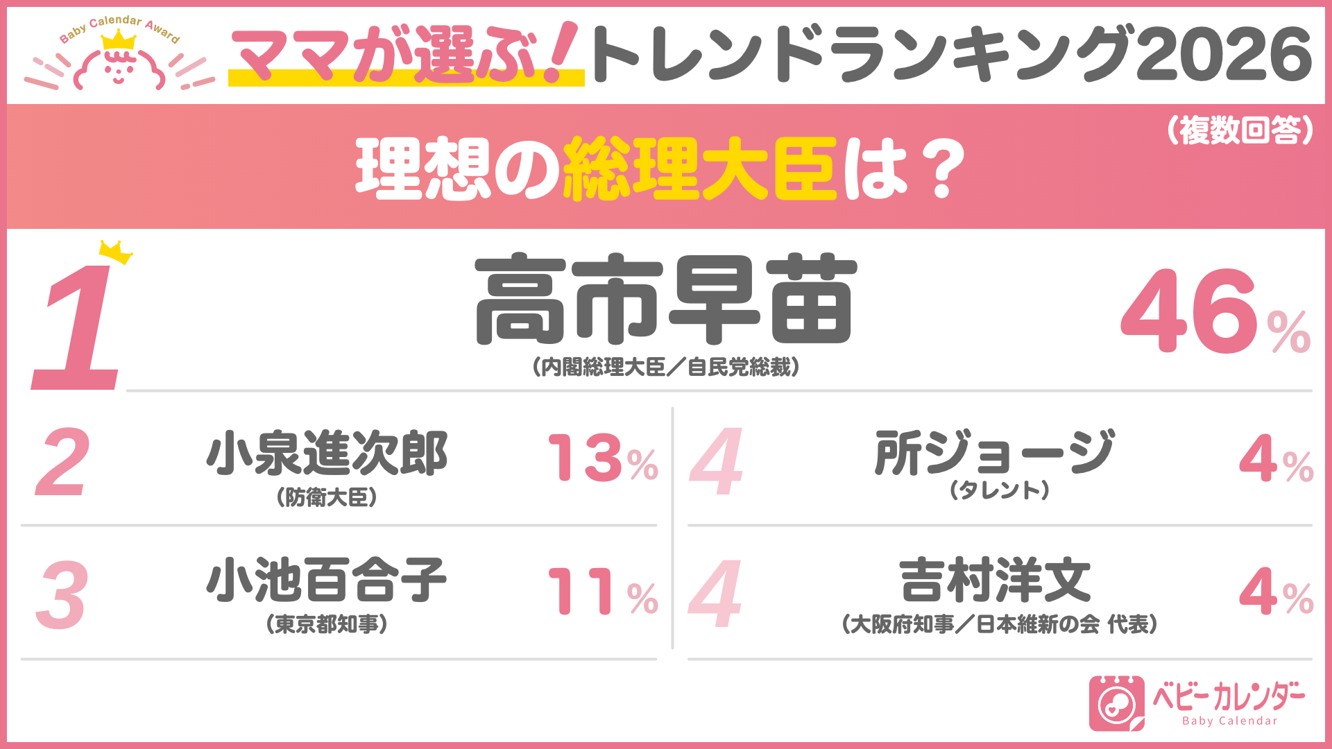 圧倒的な支持で1位に輝いたのは、現職の高市早苗さん。小泉進次郎さんや小池百合子さんなど、メディア露出が多い政治家も支持を集めています。また、タレントの所ジョージさんや、地方自治の現場から積極的に発信する吉村知事の名前も挙がり、「身近さ」「ユーモア」「現場感覚」といった共感しやすい人柄が重視されていることもうかがえます。さらに、5位以下には大泉洋さん、櫻井翔さん、林修さんといった多方面で活躍する著名人の名前もみられました。