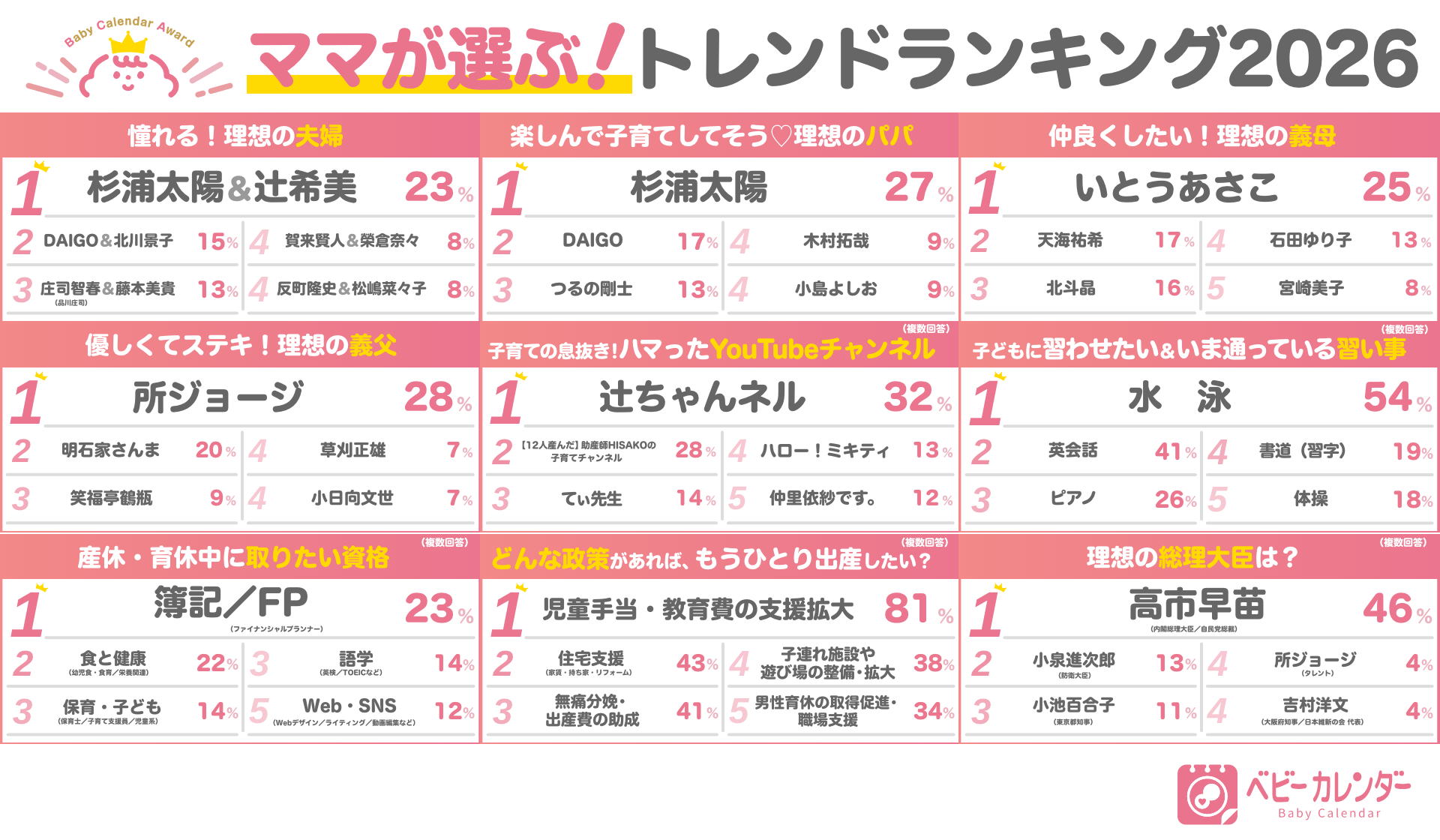 さらにスペシャル部門では、理想の夫婦・パパ・義父母をはじめ、ハマったYouTubeや産休・育休中に取りたい資格など、気になるテーマを集めた全9ランキングを一挙公開。ぜひチェックしてみてください。