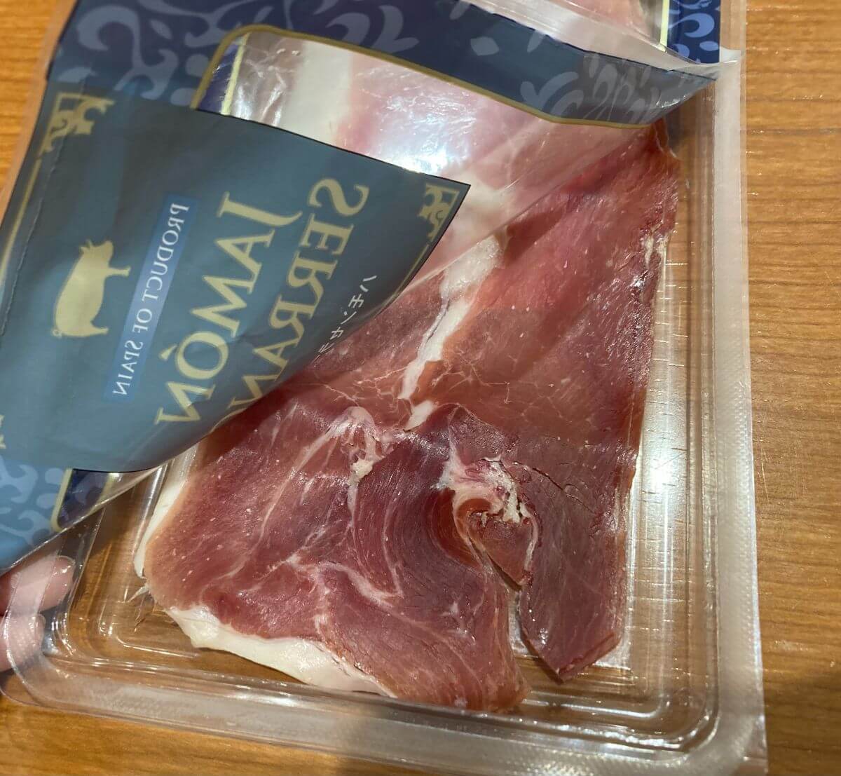 「生ハム切り落とし」も大人気商品ですが売り切れだったためこちらの生ハムを購入。ハモンセラーノはスペインの伝統的な製法で塩漬・乾燥・熟成した生ハムです。