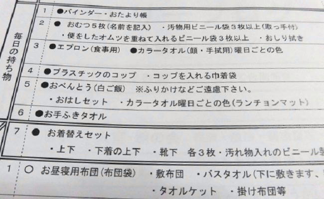 お昼寝があるため布団を用意し、週一で持ち帰って洗濯をします。お昼寝は2時間ほどで15時におやつ、そのあと夕方まで遊び、17時からテレビ鑑賞して親を待つという流れです。音楽会などもあり、保護者は全員イベントの係を担当しています。