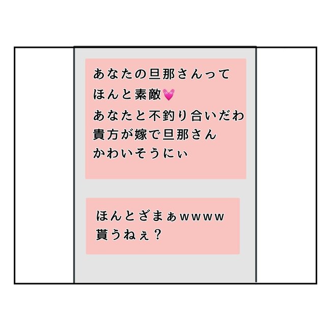 モラ夫と一夜を過ごしたときに、こっそり空さんからのメッセージを確認していたクズみ。SNSで空さんのアカウントを見つけ「貴方、夫から愛されてないんじゃない?」と嫌がらせのDMを送りつけます。