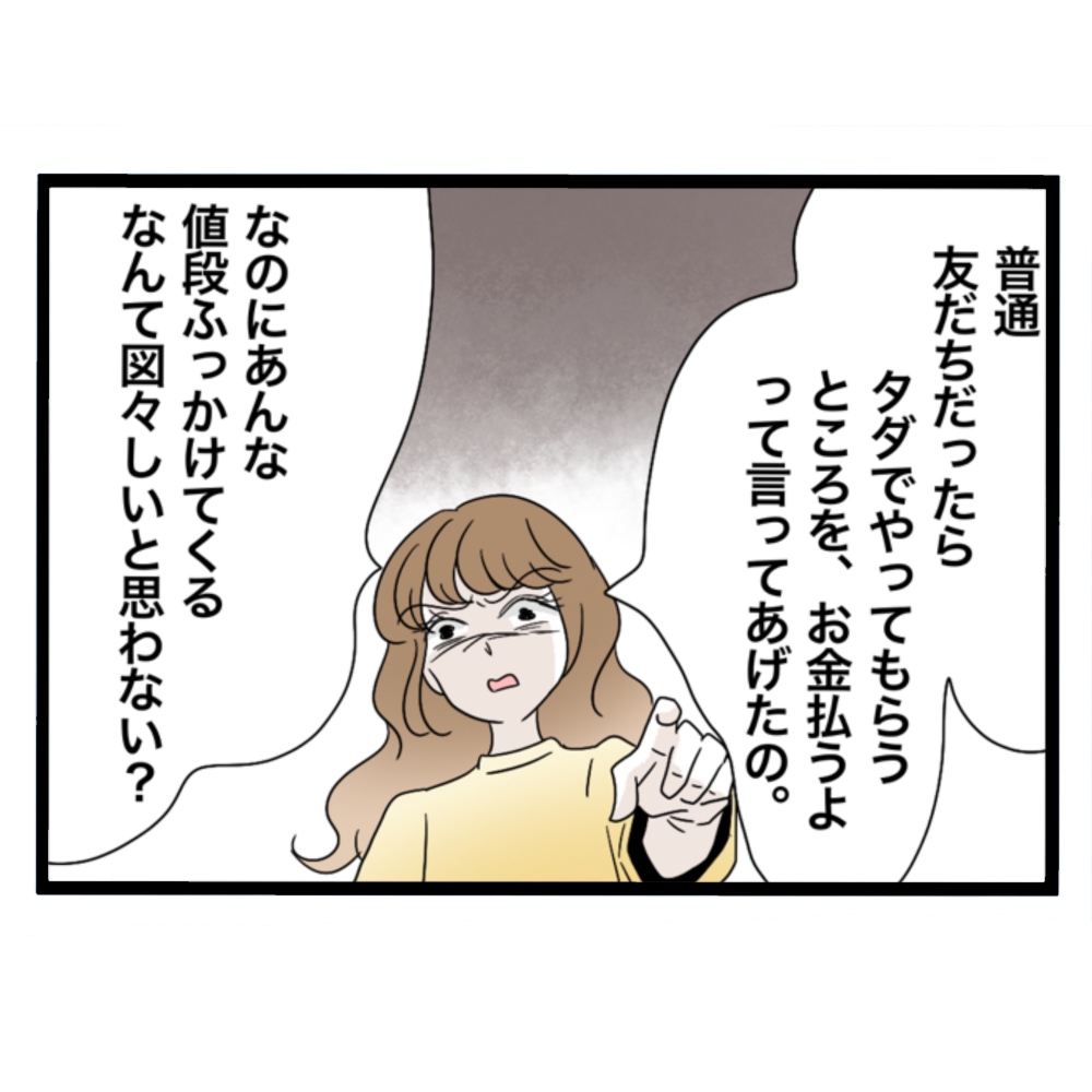 しかし、最初にお金を払うと言ったのはカキエさんのほうです。そのことをユズハさんが問い詰めると、自分からお金を払うと言ったことは認めたものの「私が提示した金額を受け入れなかった!」とさらにヒートアップ。「友だちなら無料で引き受けるのが普通。それなのに、あんな値段をふっかけてくるのは図々しい」というのが、カキエさんの主張です。
