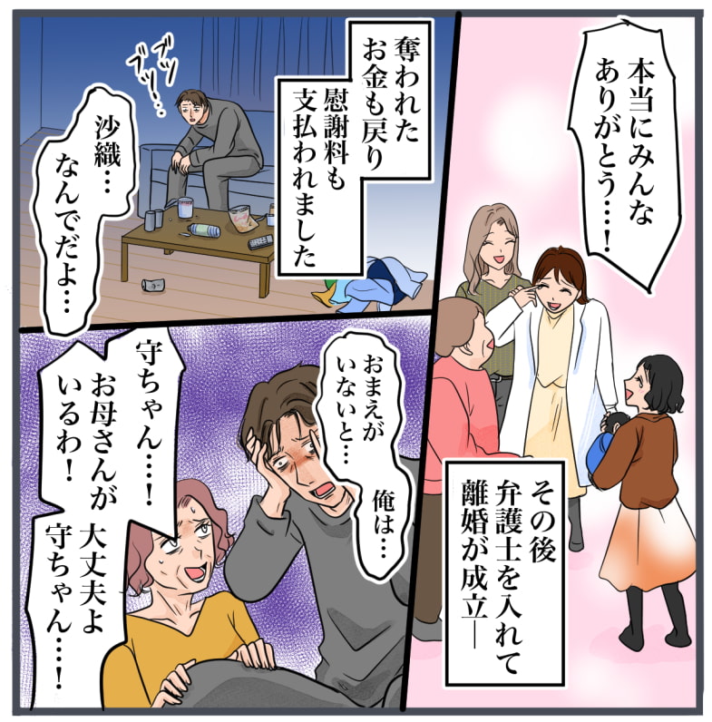 弁護士の助けもあり、離婚は無事に成立。守に奪われた貯金は全額戻り、慰謝料も滞りなく支払われました。一方、荒れ果てた部屋で一人、「おまえがいないと……」と頭を抱える守。そんな息子の背中に、「お母さんがいるわ! 大丈夫よ守ちゃん……!」という義母の声が響きます。