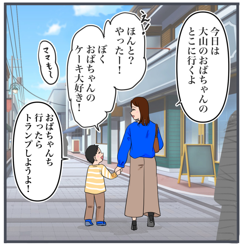 「ほんと? やったー! ぼくおばちゃんのケーキ大好き! おばちゃんち行ったらトランプしようよ!」