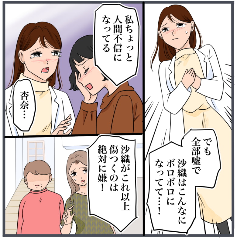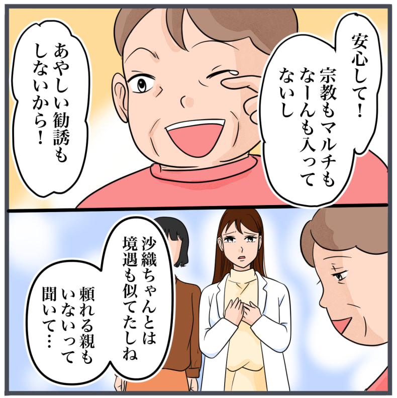 「安心して! 宗教もマルチもなーんも入ってないし、あやしい勧誘もしないから!」「沙織ちゃんとは境遇も似てたしね。頼れる親もいないって聞いて……。旦那と義母にも裏切られてあんまりでしょ」「家族じゃなくても沙織ちゃんの幸せを願う人もいるんだって知ってほしかったんだよ」「人を信じられない沙織ちゃんになってほしくないんだよ」