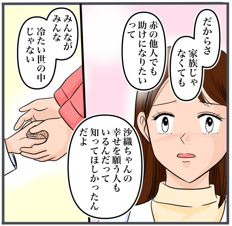 一番信じていたはずの家族からの裏切り……。両親を失い、家族に憧れていた沙織の経験したつらさを思うと、胸が締め付けられます。