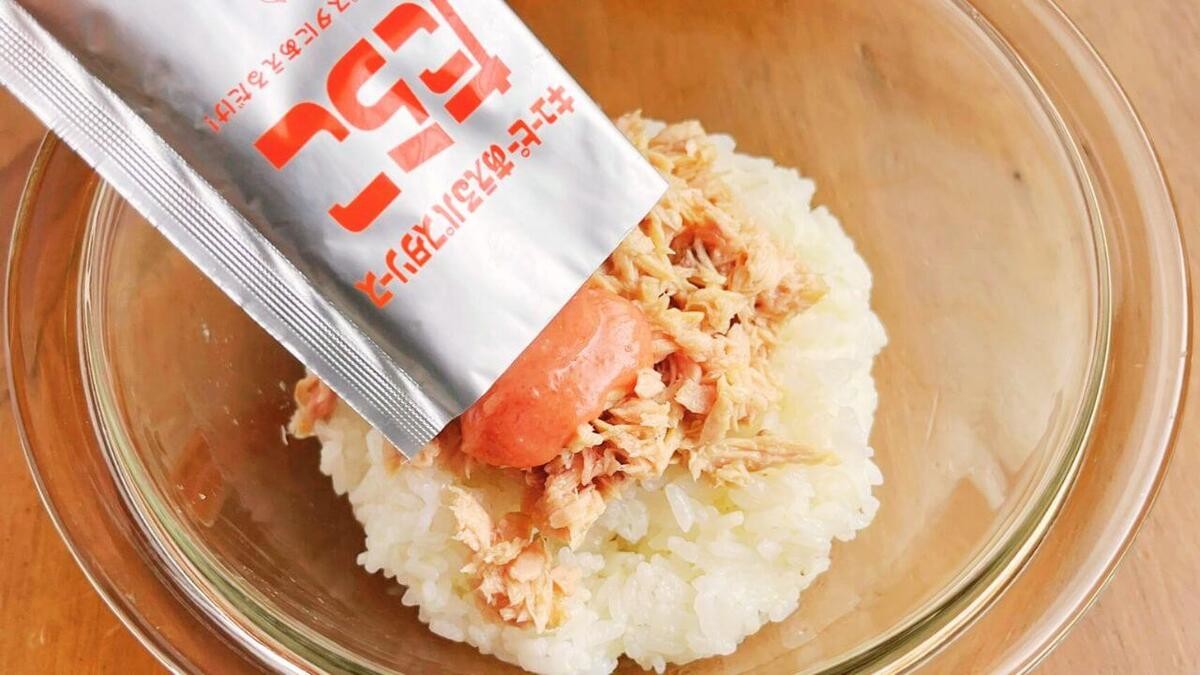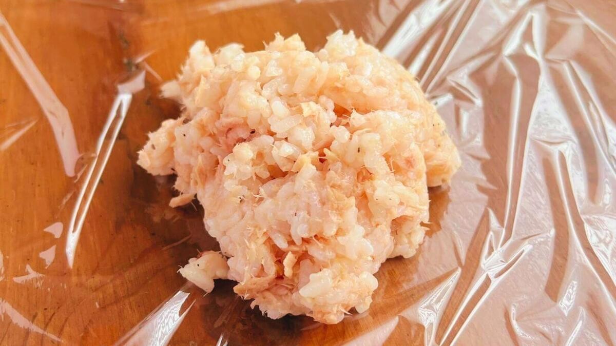 パスタソースを「パスタにかけずに」美味しく調理する「たらこツナおにぎり」の完成です。