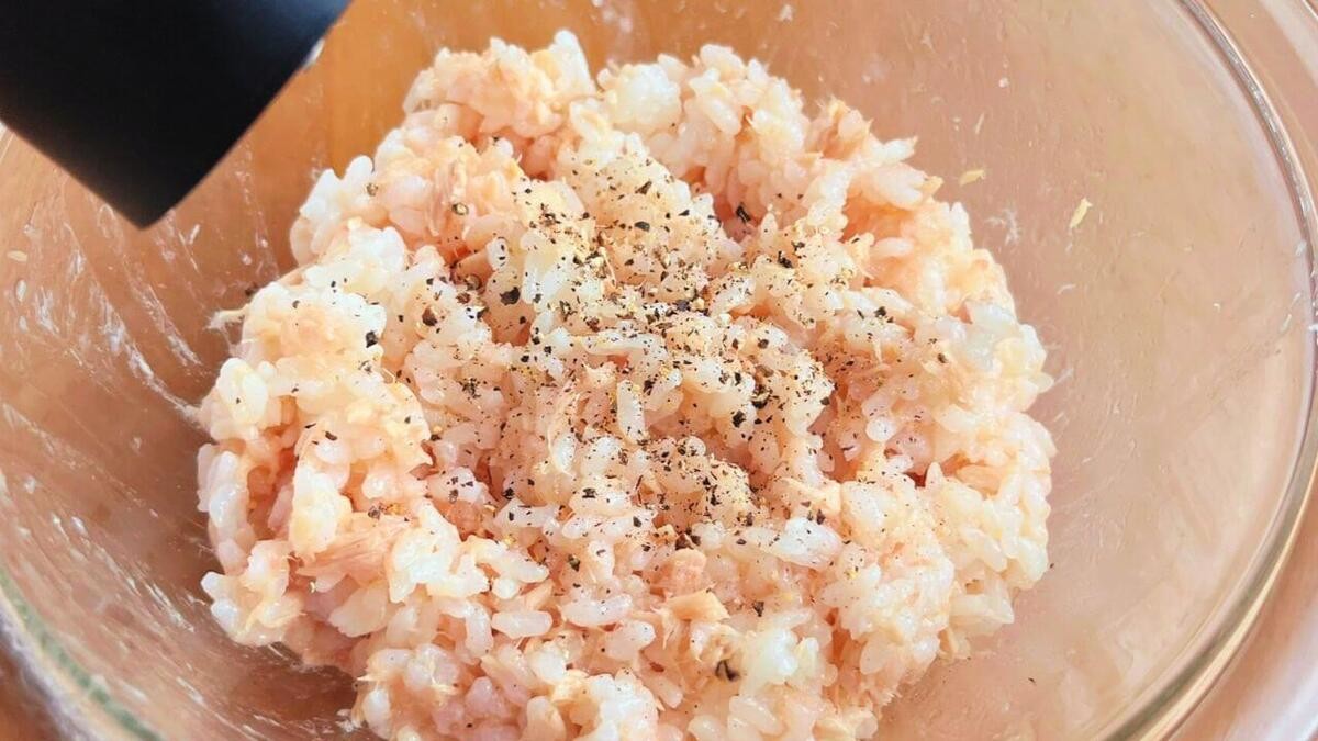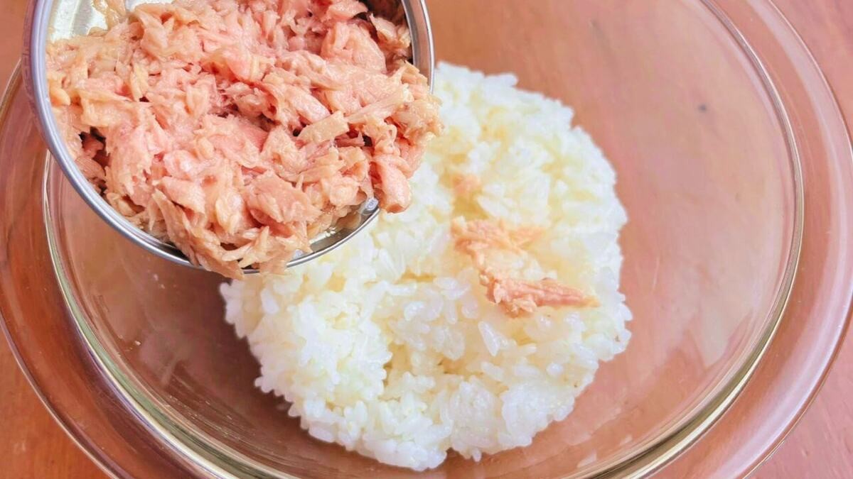 油(または水気)を切ったツナ缶を、温かい白ごはんに加えます。