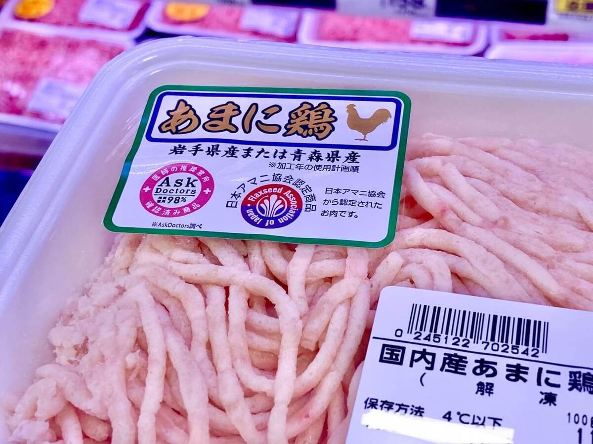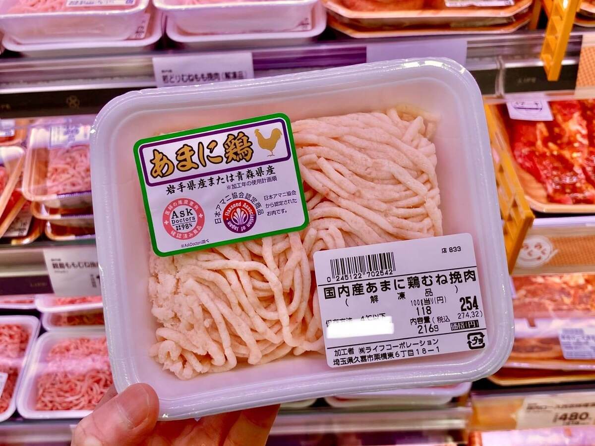これは、ライフでの人気商品“あまに鶏”のむね肉で挽いた鶏挽肉です。